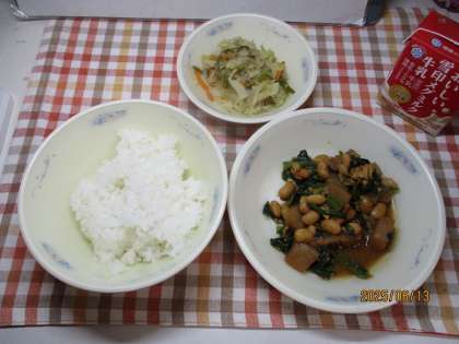 今日の献立は、「ごはん・牛乳・肉みそいため・ごま酢煮」でした。