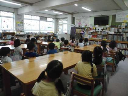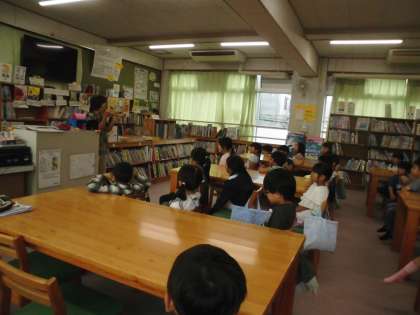 図書室で、堀本先生に読み聞かせをしてもらいました。その後、借りている本を返し、新しく本を借り、読書をしました。