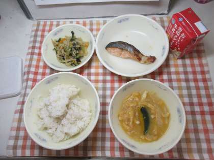 今日の給食は,「麦ごはん・牛乳・さけの塩こうじ焼き・小松菜と切り干し大根の煮びたし・かぼちゃのみそ汁」でした。
