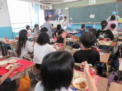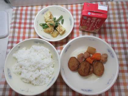 今日の給食は、「ごはん・牛乳・平天とこんにゃくの煮つけ・みそかんぷら」でした。