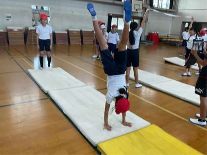 体育科ではマット運動の学習を進めています。美しく回ることや、頑張ればできそうな技に挑戦しながら取り組んでいます。