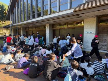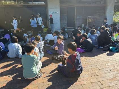 冒険の森の活動を終えて、14時45分に玄関前広場に戻ってきました。プレイホール前に移動して、ジュースタイムです。冒険の森の活動の充実感からか、ジュースで乾杯している児童もいました。