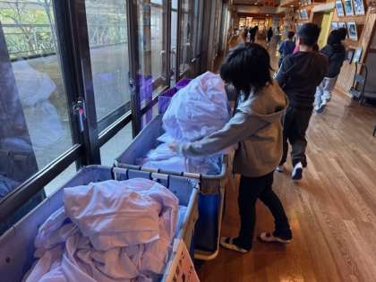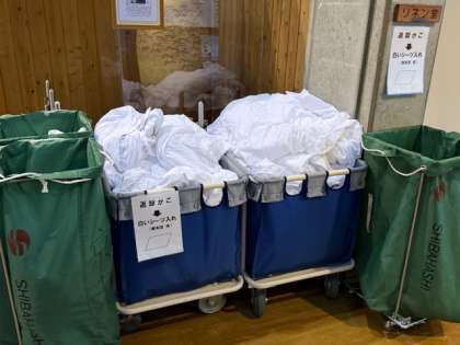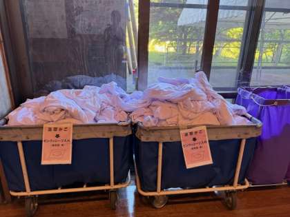 今回から、シーツは簡単にまとめて返却することができるようになりました。これまで、シーツをきれいにたたむのに、子どもたちはとても苦労していましたから、これはとても時短になります。よかったあ!