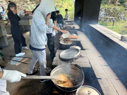 どのグループも無事に火をおこして、ご飯とカレーを調理しています。カレーのルウを入れてかき混ぜるとき…煙たくて大変です。。。