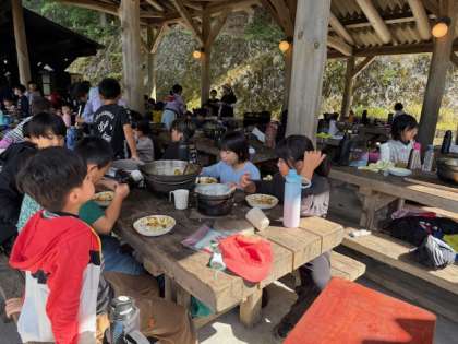 「おいしー」「うまくできたー」「この野菜、私が切ったよ」…と、自分たちで作ったカレーは、いつも以上に美味しく感じられるようです。