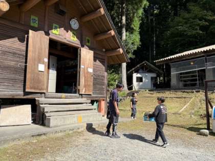 お皿や鍋を洗い終わったら、山の家の職員の方に点検してもらいます。洗い残しがなく「合格」をもらったら、炊具倉庫に片付けて、野外炊事は無事に終了です。みんな、よくがんばりました。