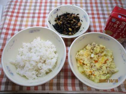 今日の献立は、「玄米ごはん・牛乳・ふっくらだし卵・ひじき豆」でした。