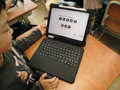 タブレットを使って、せんりつづくりをしました。5つの音から3拍分の旋律をつくりました。作った旋律を使って、みんなで、鍵盤ハーモニカでまねっこをしたり、よびかけっこをしたりしました。