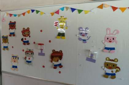 給食室9月の掲示は動物の運動会です。調理員さんの手作りです。かわいい動物たちが玉入れをしています!