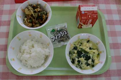 給食の献立は,「ごはん,牛乳,かきあげ,かきたま汁,じゃこ」でした。みんなで楽しく給食を食べました。完食でした!給食の後には,いろいろな種類の野菜について学習しました。