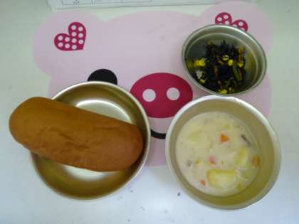 黒糖コッペパン・じゃがいものクリームシチュー・ひじきのソテーでした。