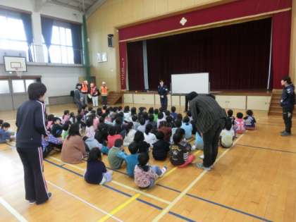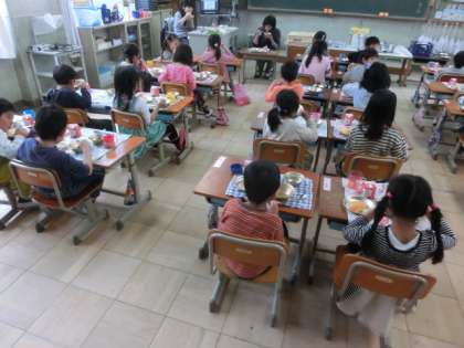 高学年が登校班をしっかりリードしています。写真のように去年から意識させていたくつ箱のくつはきれいに並んだ状態が続いています。今週から,給食が始まりましたが,1年生の児童もしっかりと給食を食べています。昨日は交通安全教室を1年生対象に実施。安全な登下校について勉強をしました。