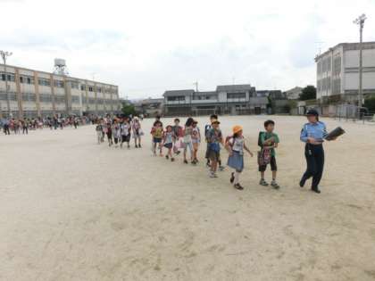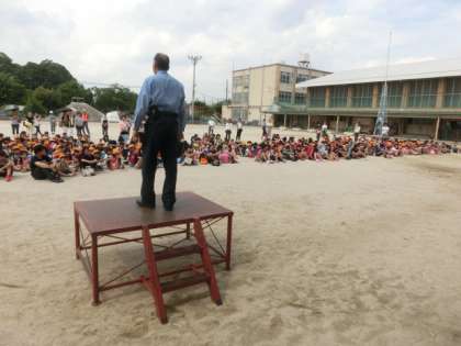 7月に大きな集会が二つありました。ひとつは町別集会。もうひとつは唐橋児童館祭りです。町別集会は7月2日に行いました。集会の最後に運動場に集まり,南警察署のメンバーをはじめとする区役所・土木事務所や地域の皆様とともに,集団下校をしました。運動場に集まって,私や南警察署の署長の話を聞くときはきちんと出来ており,運動場でもしっかりとした態度で行えるようになったことを嬉しく思っていました。