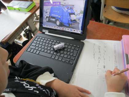 今日は、タブレットを使って好きな自動車を選んで、「しごと」と「つくり」をタブレットの図鑑から抜き出したり、考えたりしてプリントにまとめました。