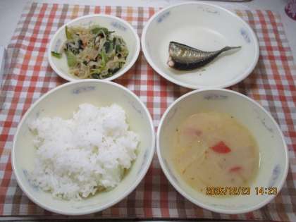 今日の献立は、「ごはん・焼き開干しさんま・小松菜と切干大根の煮びたし・京野菜のみそ汁」でした。