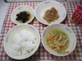今日の献立は、「ごはん・ツナそぼろ丼(具)・黒豆・キャベツの吉野汁」でした。