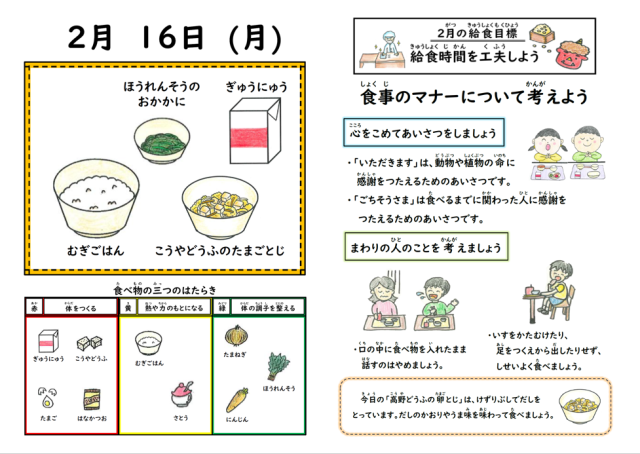 今日の献立は、「麦ごはん・牛乳・高野豆腐の卵とじ・ほうれん草のおかか煮」でした。