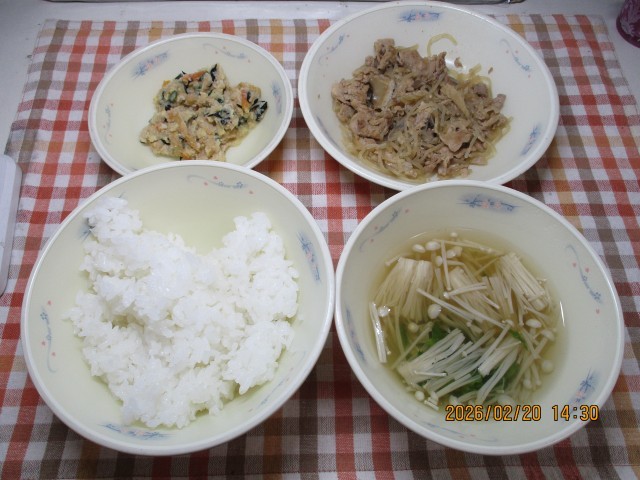 今日の献立は、「ごはん・豚肉とこんにゃくのいため煮・おから・花菜のすまし汁」でした。