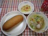 今日の献立は、「味つけコッペパン・牛乳・肉団子のスープ煮・じゃがいものいためもの」でした。
