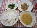 今日の献立は、「麦ごはん・牛乳・おからツナ丼の具・小松菜のごまいため・いものこ汁」でした。