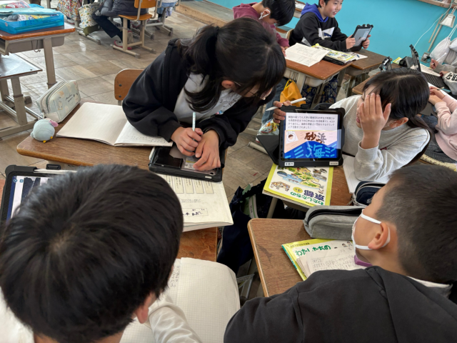 社会科「ゆたかな自然を生かす宮津市」の学習で、誰がどのようにして美しい天橋立を守っているのかについて調べました。調べたことをロイロノートに分かりやすくまとめ、伝え合うことができました。