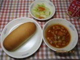 ポークビーンズは、やわらかい大豆にトマトの味がよくしみ込んでいて、パンにもよく合う献立でした。子どもたちは、「パンと一緒に食べるとおいしい!」と言って、もりもりと食べていました