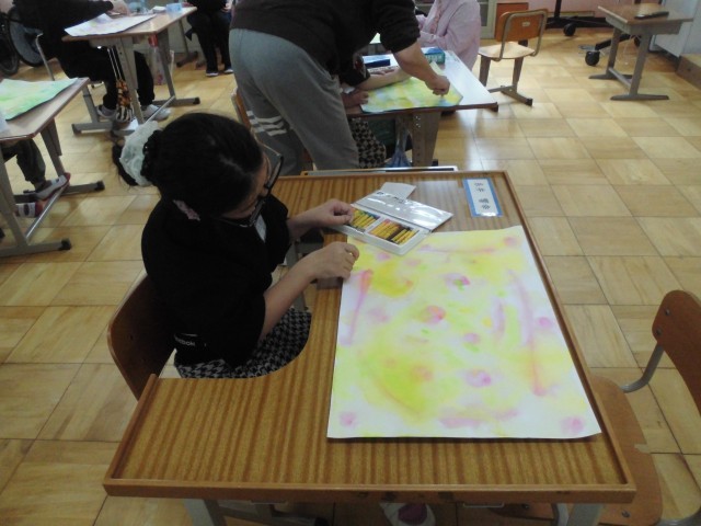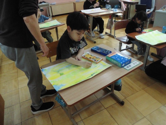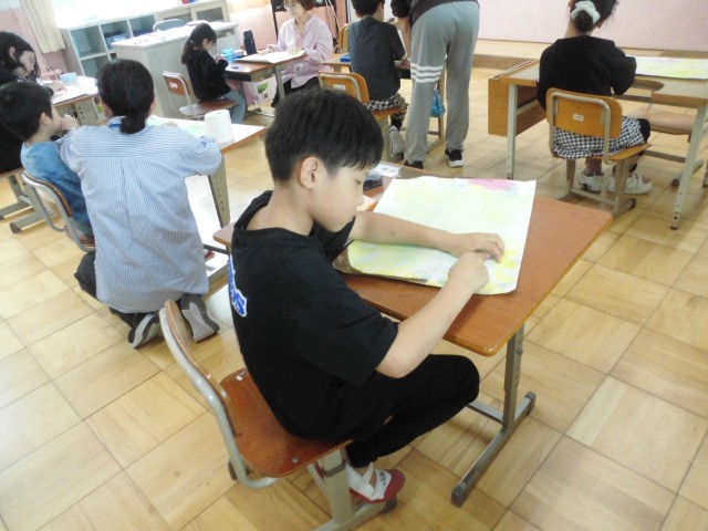 4組では、「春」をテーマに、一人ずつ絵を描きました。桜などの春らしい植物を描いている児童もいました。児童一人ひとりクレパスを使って素敵な絵を完成させることができました。