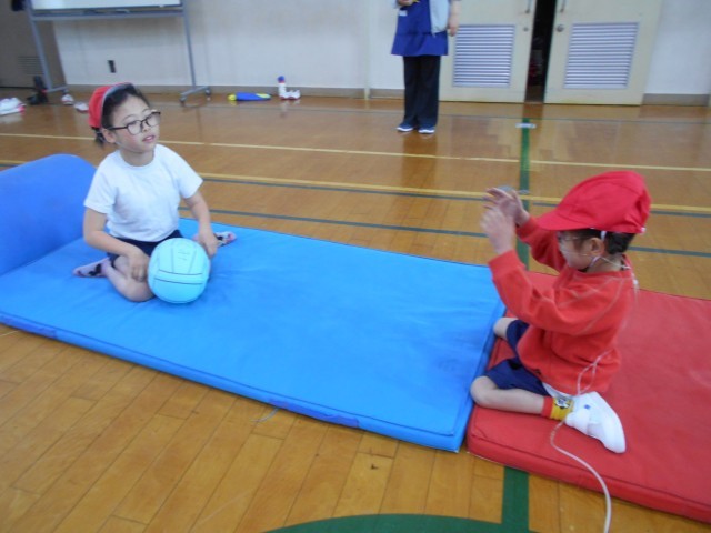 天気が雨ということもあり、初めての体育の学習は、体育館で行いました。ソフトバレーボールを使用して、ボールをついたり、友達に渡したりしながら体を動かしました。