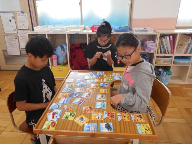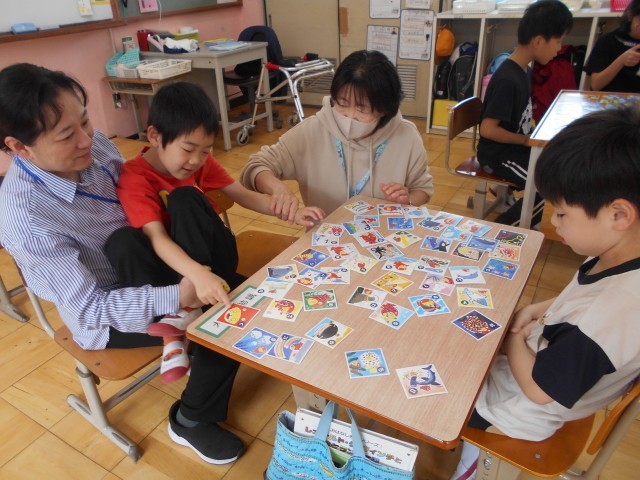国語の学習では、グループに分かれてカルタを行いました。5、6年生は友達よりも早く取ろうと必死になっていました。