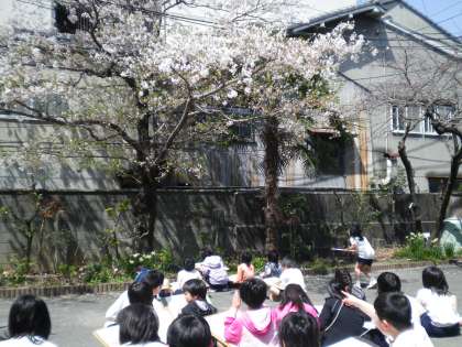 図工で,桜の木を写生しました。桜の木の幹や枝をじっくり見て,細かいところまで,コンテで下書きをしました。ダイナミックな絵ができあがっていました。色をぬって,完成するまでが楽しみです。