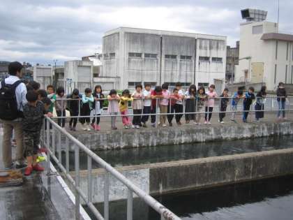松ケ崎浄水場は京都市内に3か所ある浄水場のうちの1つです。「わたしたちの京都」の本の中で学習している浄水場の様子を,自分の目で実際に見ることができて,学園生はとても興奮していました。見学中には,新しい発見や疑問などについてのつぶやきがたくさん出ていました。