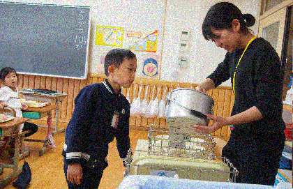 油あげのチャンプルは,たまねぎ,にんじんといった野菜をひと口大の油揚げと共に甘く煮付け,卵を炒ってあります。「チャンプル」には「混ぜたもの」という意味があるそうです。クーブイリチーは,直訳すると「昆布(クーブ)炒め煮(イリチー)」の意味のとおり,切干大根と豚肉を細切りの昆布,こんにゃくとともに煮付けた料理です。ちなみに沖縄料理でよく使われる昆布(消費量も全国トップクラス)ですが,県内では全く獲れません。300年ほど前,特産品である黒砂糖と北海道で獲れた昆布を交換していたことが始まりのようです。「僕,もっと食べる〜」とクーブイリチーをおかわりする1年生,もりもり食べる姿も素敵です。パインゼリーは,なんと大きな果肉入り。甘酸っぱいゼリーは学園生たちに大人気でした。美味しい給食ごちそうさまでした。来年の沖縄給食がすでに待ち遠しいです。