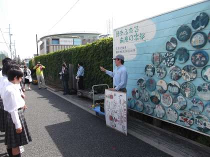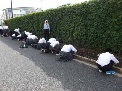 活動のはじめに,花を植えた新町通りは,年間に数十万人が往来されるとお話しいただきました。また,この取組は二酸化炭素の排出削減だけでなく,地域の方にも花を楽しんでもらうことができる取組です。陶化中学校の頃から続く地域での取組として,7年生も暑い中ですが,伝統を感じ一生懸命花を植えました。