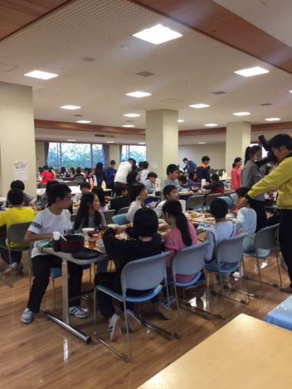 6時過ぎから夕食が始まりました。今日のメニューは,トンカツ・サラダ・野菜炒め・ご飯・味噌汁です。みんな,もりもり食べて元気です。