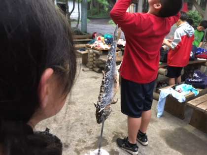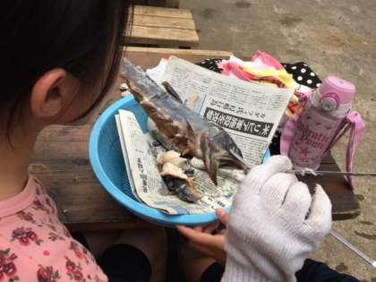 と言いながら,掴んだアマゴをさばきました。自分で串を刺して炭火で焼きます。一口食べると,「美味しい!!」