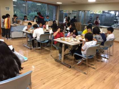 その後は夕食!メニューは唐揚げに野菜のカレー炒めなど。モリモリ,パクパク食べています。笑顔で会話も弾んでいます。