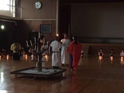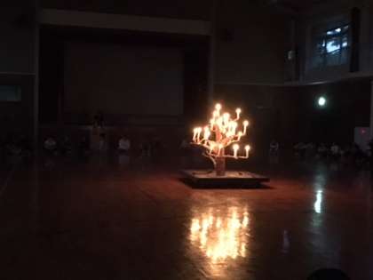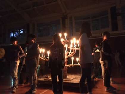 天気予報で雨の可能性もあったので,体育館でキャンドルファイヤーをしました。火の神からは,規律・協力・奉仕の火を分け与えてもらいました。ひとつひとつのロウソクの灯りが集まると,みんなの顔が見えるぐらいの明るさになりました。