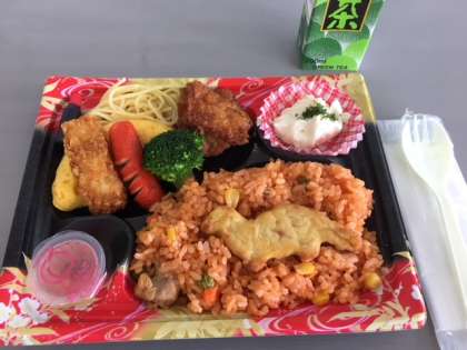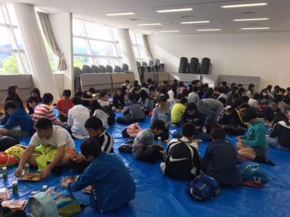 外は晴れ間が見えてきました。昼食はお弁当。恐竜ナゲットが入っています。班で食べる最後のごはんです。思い出をいっぱい語っていることでしょう。