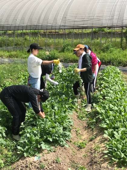 左は菜園作業中の様子です。野菜を大きく育てるために間引きをしているところです。