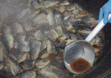 主役のにしんは下処理で丁寧に切られ,じっくりと甘く煮付けていきます。横に添えるこちらも主役のナスは給食調理員4名で一口大に切っていきます。煮汁に溶け出したにしんの脂がナスに染みわたる…まさに相性抜群の組み合わせです。削り節とこんぶの出汁,ふわふわの卵が美味しいかきたま汁もにしんなすの美味しさを引き立てていました。