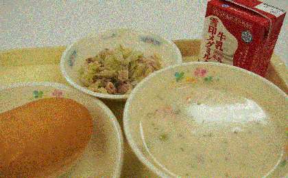 今日の給食は「コッペパン(国産小麦100%)」「ハムサンド(具)」「チャウダー」でした。ハムサンドの具を自分でコッペパンに挟んで食べる【手作りする】献立です。