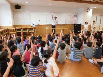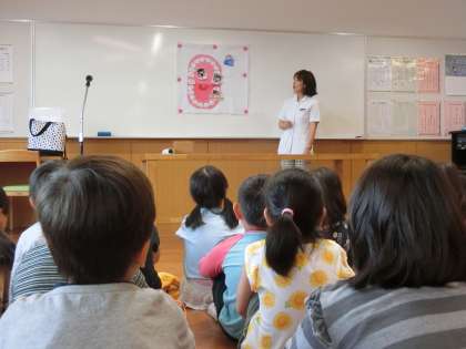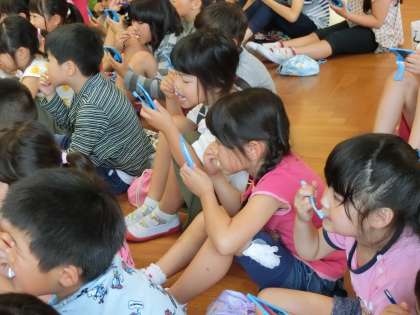 学校歯科医師の方と歯科衛生士の方に来て頂き,正しい歯の磨き方について教えて頂きました。パネルシアターを見ながら,歯磨きの大切さについて知り,その後,実際に歯ブラシを使いながら歯磨きの方法を学びました。