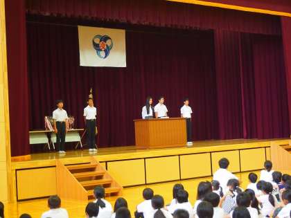 始業式後は,児童生徒会本部から夏休み中の京都市子ども未来会議やリーダー講習会の報告,ハッピースクール大作戦や7月豪雨災害義援金の呼びかけがありました。よりよい学園にしていくため,児童生徒会本部を中心にみんなで取り組んでいきたいと思います。