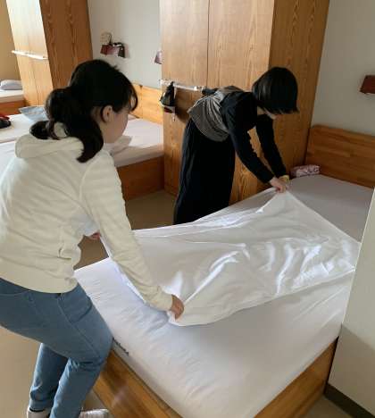 今日はシーツ交換をするので,協力してシーツを畳みます。