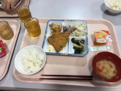 夕食のメニューは,アジのフライ,肉じゃが,小松菜のしめじみぞれ和えなどです。