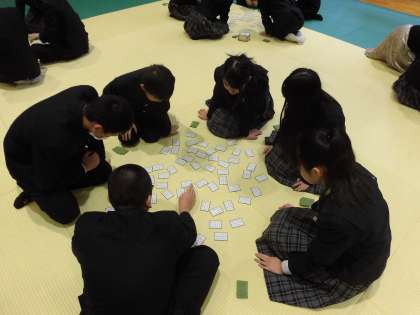 六段の調べ(段物と呼ばれる箏曲のひとつ)が流れる中,集中した表情で札を探す姿が印象的でした。しっかりと自分の好きな札を決めて,上の句が読み始められてすぐにとっている学園生もいました。集中した中にも終始穏やかで楽しい時間が流れていました。