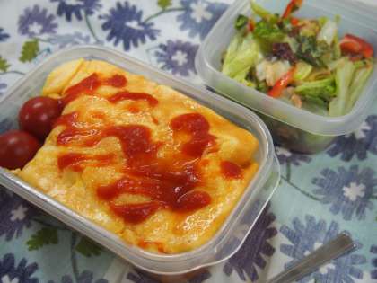 今日のお弁当は,みずみずしさと甘みが特徴の新玉ねぎを使ったオムライスとサラダにしてみました。暑い日が続きます,元気な姿でお会いできることを楽しみにしています!しっかり食べてくださいね!