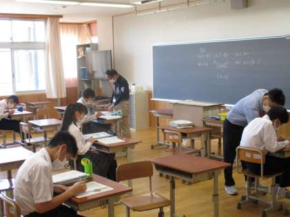写真は9年生(右)と5組(後期課程)の授業中の様子です。