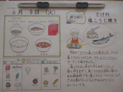 写真は9年生の様子(左)と今日の給食献立(右)です。