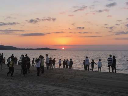 宿に到着。とても綺麗な夕日。特別スペシャルで海岸へ行き、みんなで夕日を眺めました。感染対策で我慢していた部分もあったご褒美が、こんなところでいただきました。